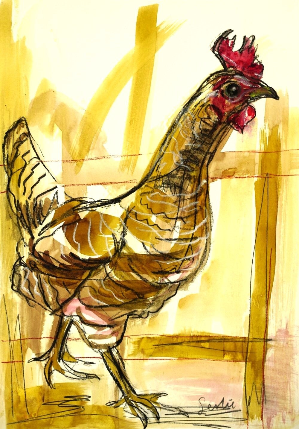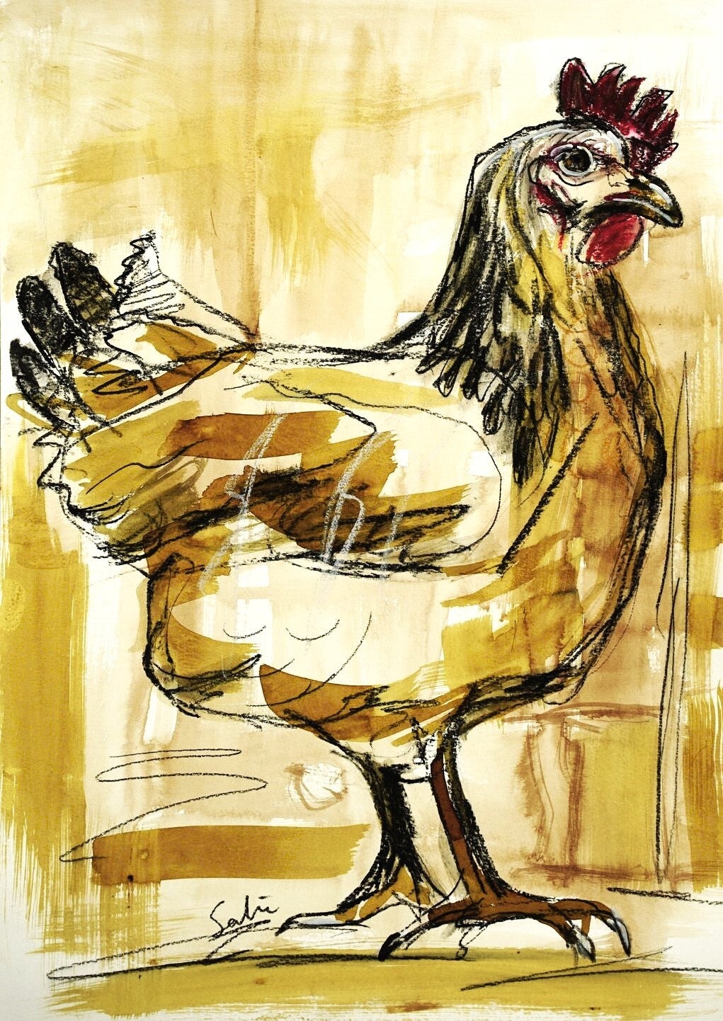 Ook zo een zin in het voorjaar? Deze snelle kippen zijn speciaal gemaakt voor de concept store in Zaltbommel.. Geschilderd met bister en krijt, op stevig papier, A3 formaat Prijs 75 euro per schilderijtje.